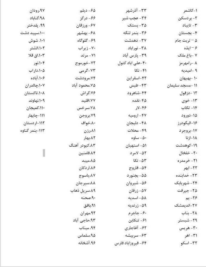 کما صباح اليوم، احتشد القائمون بالتصوير بالأشعة تجمعا احتجاجيا أمام مبنی وزارة الصحة لحکومة الملا روحاني للإعتراض علی البلاغ الحکومي بشأن الموجات فوق الصوتية. وجری التجمع في الطقس الممطر.وفيما يلي أسماء 113 مدينة: