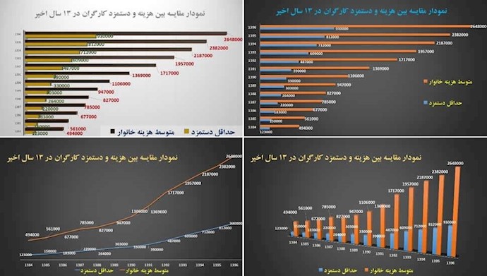 من خلال هذه الصور، يمکن ملاحظة أن تکلفة الأسرة العاملة أکبر بثلاثة أضعاف من الحد الأدنی للأجور، والتي قصمت ظهر العامل.