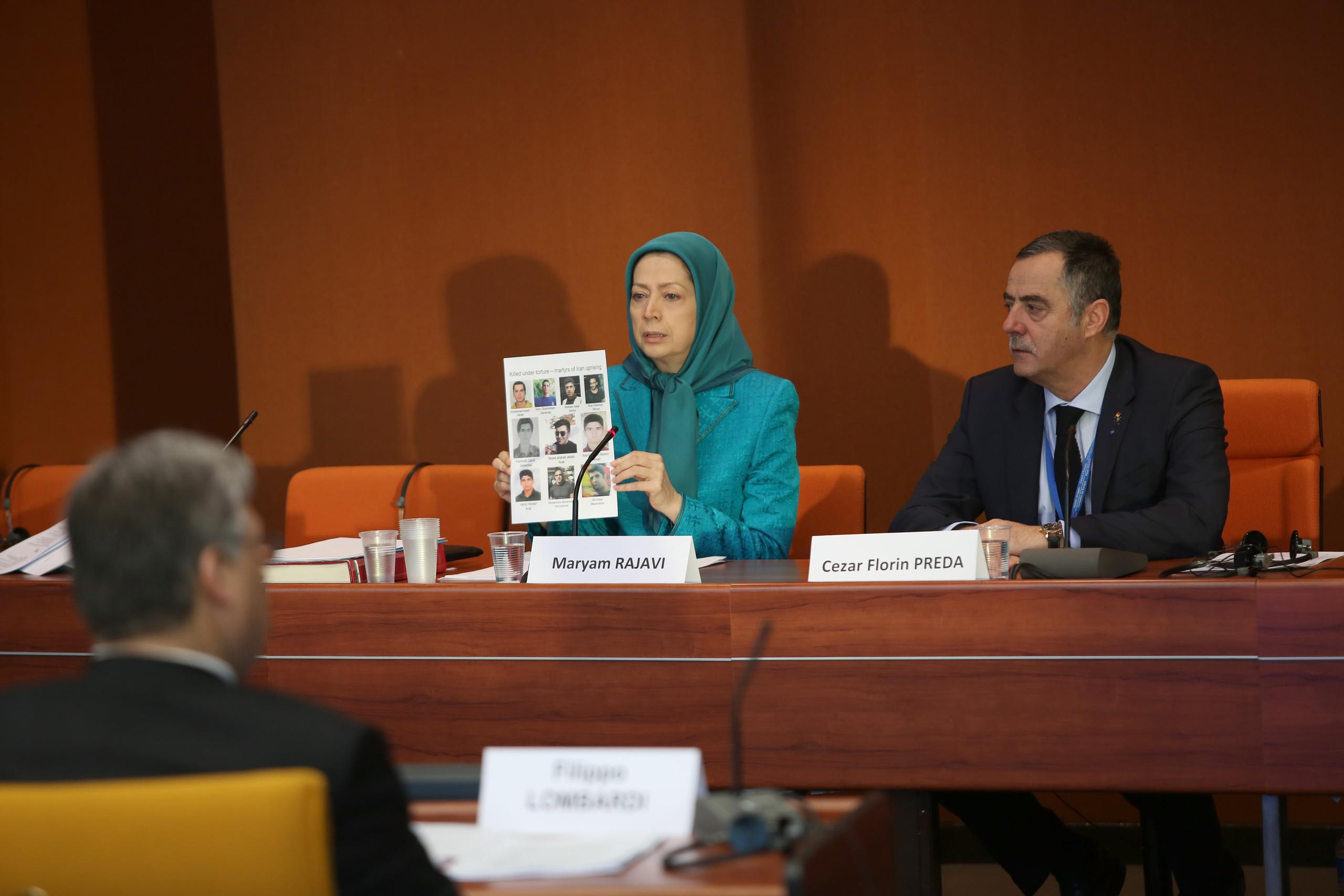 وحثّت رجوي، في ملاحظاتها، مجلس أوروبا والدول الأعضاء اعتماد تدابير فعّالة وقرارات مُلزمة لإجبار الديکتاتورية الدينية الحاکمة في إيران علی الإفراج عن السّجناء المحتجزين أثناء الانتفاضة واحترام حرية التعبير والتجمّع، ووضع حدّ للقمع وإلغاء الحجاب الإلزامي ضدّ المرأة.