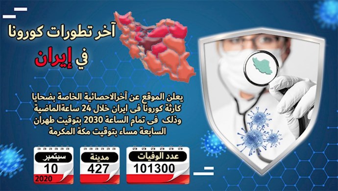 أعلنت منظمة مجاهدي خلق الإيرانية، بعد ظهر اليوم الخميس، 10 سبتمبر 2020، أن عدد ضحايا كورونا في 427 مدينة في إيران قد تجاوز 101300 شخص.