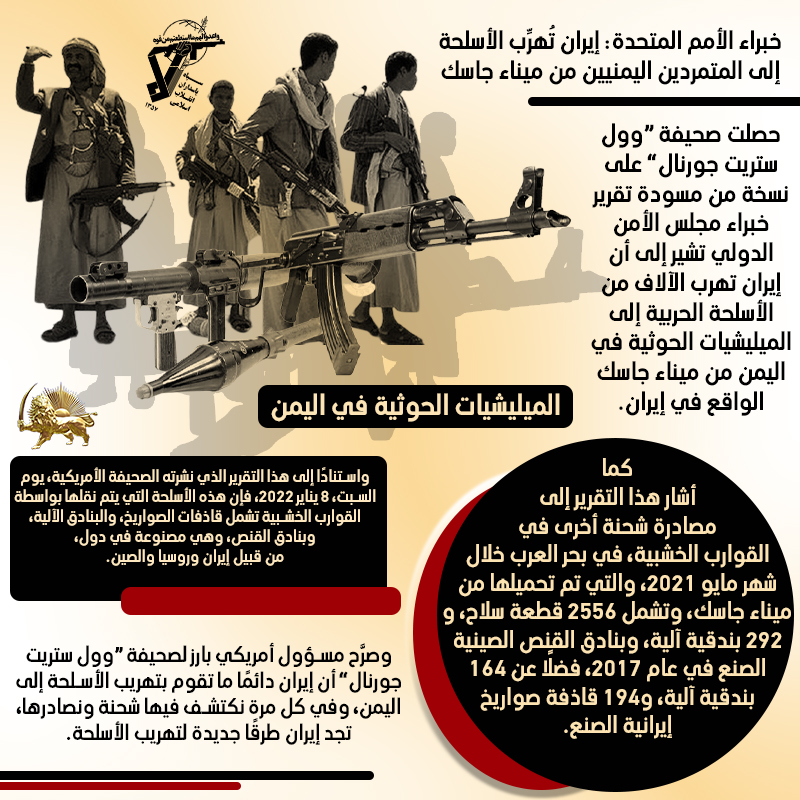 حصلت صحيفة “وول ستريت جورنال” على نسخة من مسودة تقرير خبراء مجلس الأمن الدولي تشير إلى أن إيران تهرب الآلاف من الأسلحة الحربية إلى الميليشيات الحوثية في اليمن من ميناء جاسك الواقع في إيران.