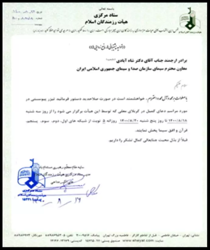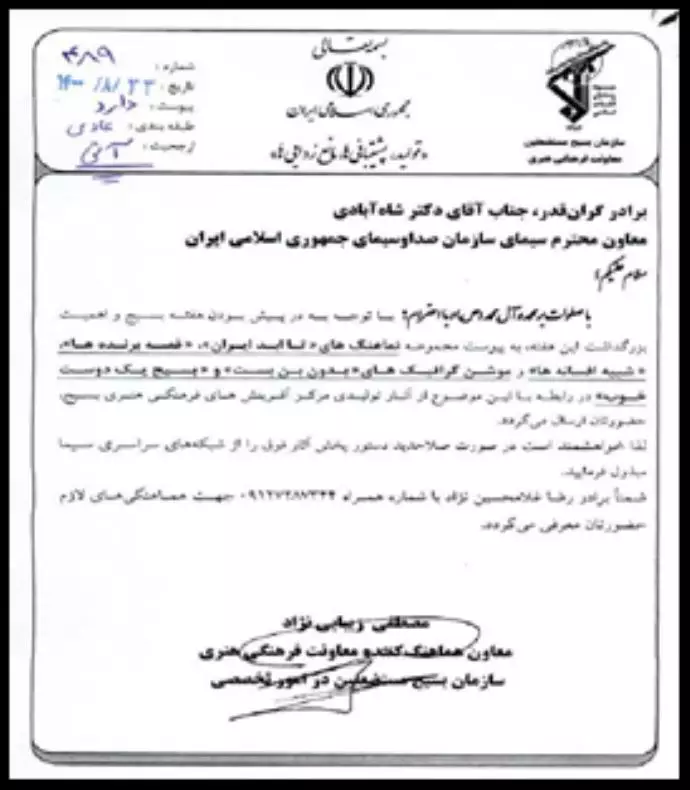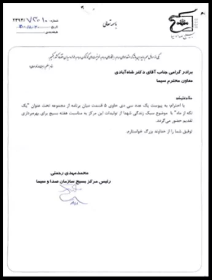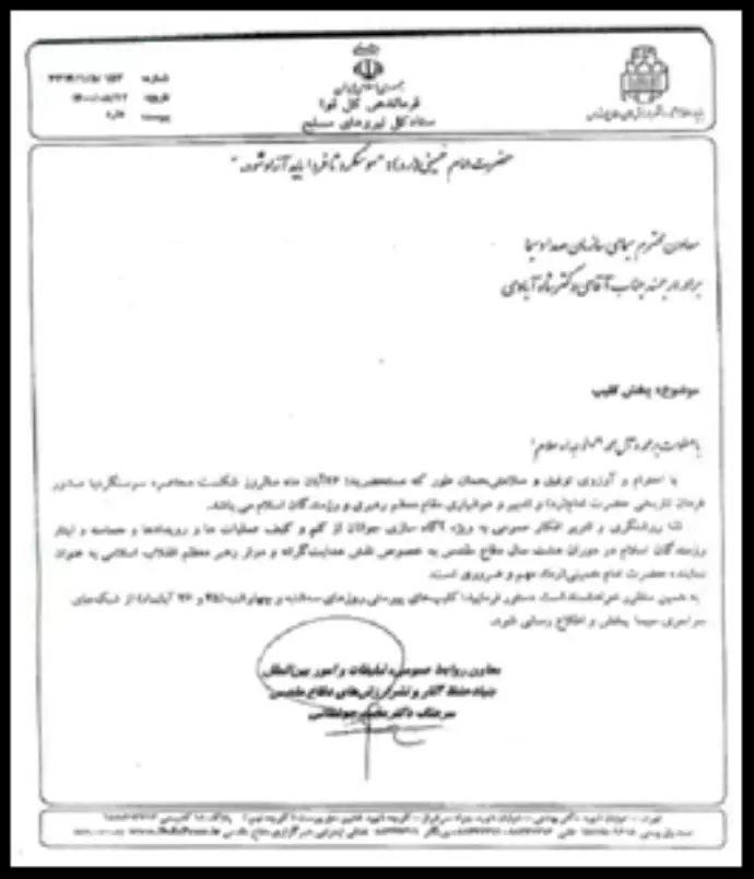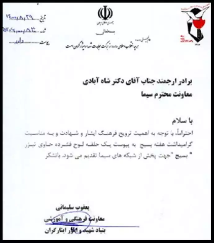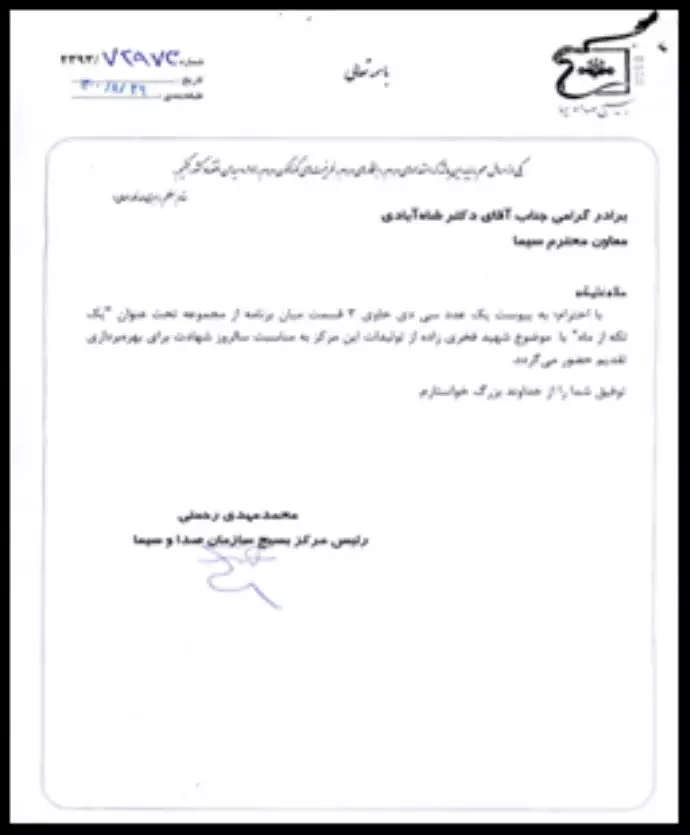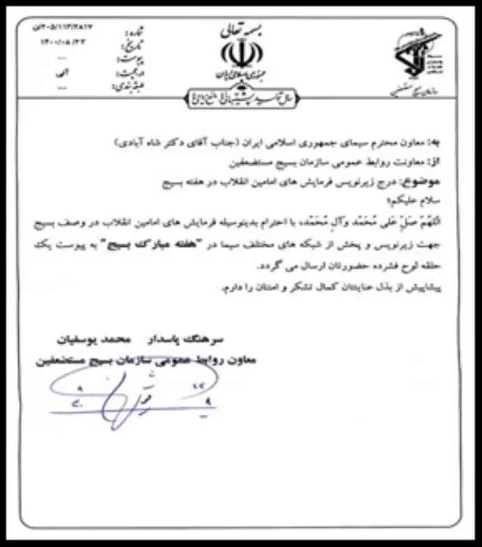 رسالة من رئيس مركز الباسيج للإذاعة والتلفزيون لبث إعلان دعائي