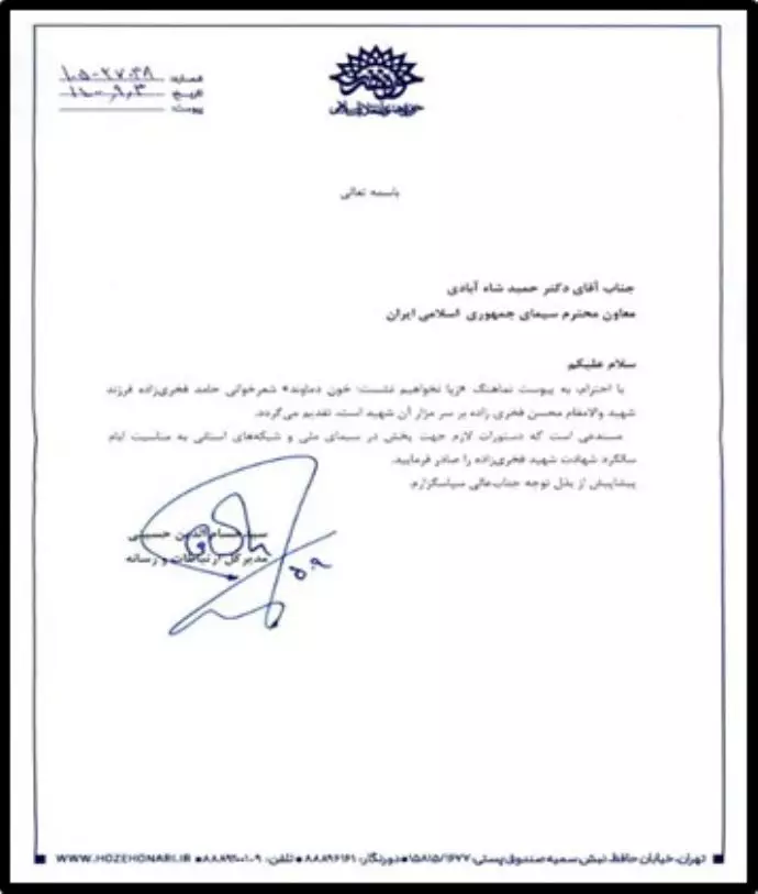 رسالة من العميد أمير علي حاجي زاده قائد القوة الجوفضائية في الحرس إلى بيمان جبلي رئيس مؤسسة الإذاعة والتلفزيون للنظام للترويج للذكرى العاشرة لهلاك حسن تهراني مقدم، القائد السابق لقسم الصواريخ في الحرس