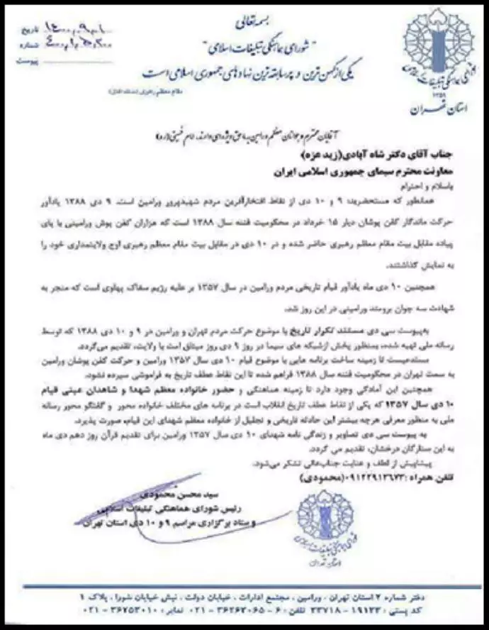 رسالة من السيد محسن محمودي، رئيس مجلس الإعلام الإسلامي ولجنة إقامة مراسيم 30 و 31 ديسمبر في محافظة طهران.