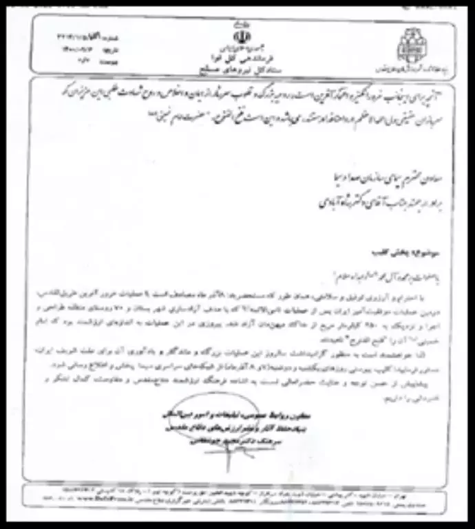 رسالة من العقيد محمد يوسفيان نائب مسؤول العلاقات العامة في “منظمة باسيج المستضعفين”