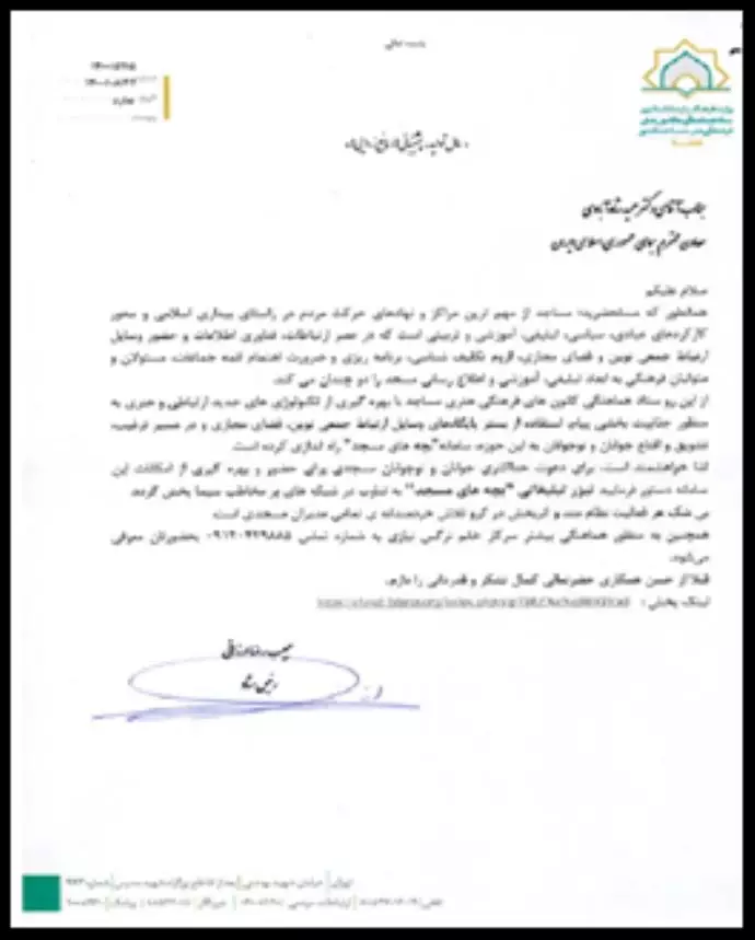 رسالة من حبيب رضا أرزاني رئيس لجنة التنسيق للمراكز الثقافية والفنية بالمساجد في وزارة الثقافة والإرشاد الإسلامي.
