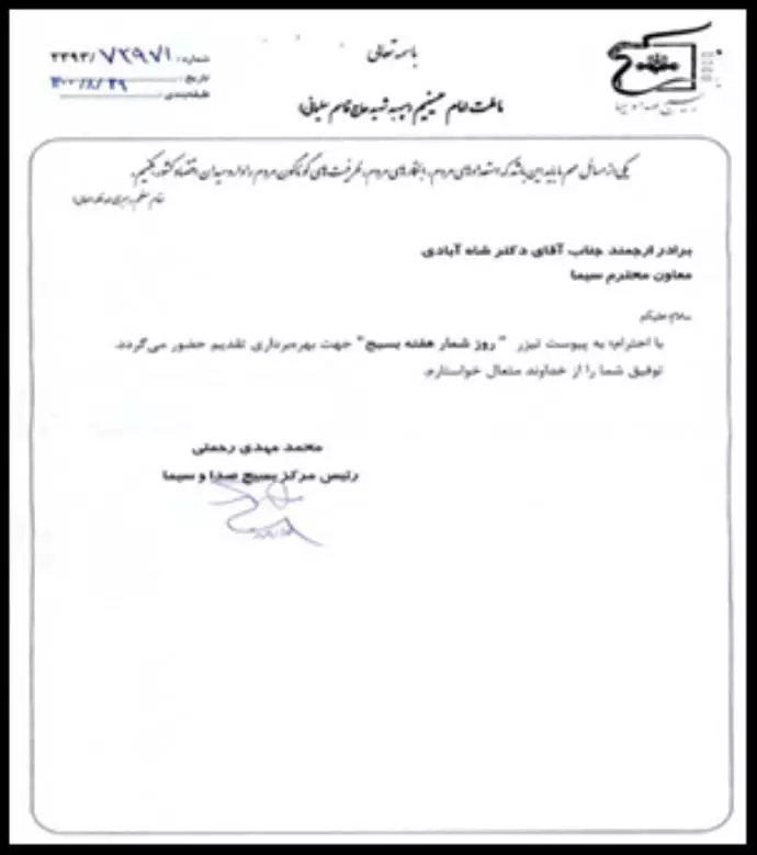 رسالة محمد مهدي رحمتي رئيس مركز الباسيج للاذاعة والتلفزيون الى شاه آبادي