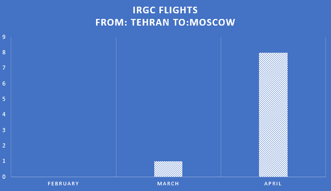 في أواخر مارس، كانت هناك رحلة واحدة (EP-PUS – طائرة الحرس الإيراني – التاريخ: 24 مارس). وفي أبريل، زادت عدد الرحلات ،الوقت كانت جيده جداً، رصدت 8 رحلات لطائرات الحرس إلى موسكو (حتى الآن: 24 أبريل 2022)