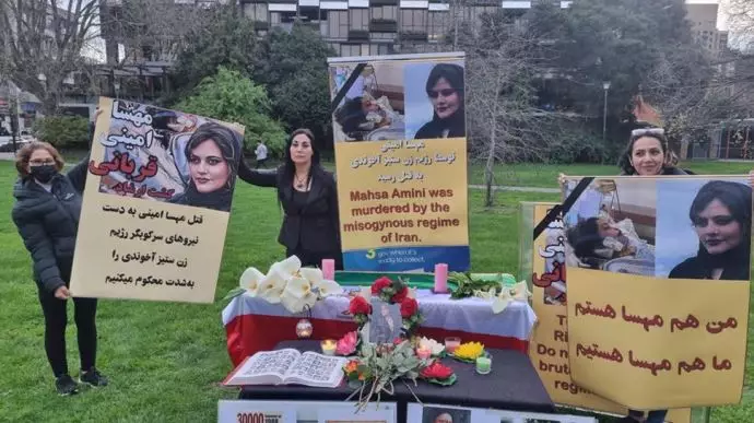 وكان الإيرانيون الاحرار يحملون لافتات تحمل صورًا لـ مهسا أميني وهتفوا: