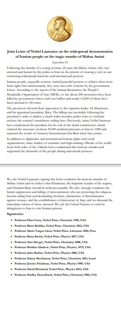 ندين نحن الحائزين على جائزة نوبل مقتل مهسا أميني، ونعتقد أن خامنئي ولي فقيه النظام وإبراهيم رئيسي يجب أن يخضعا للمسائلة، كما ندين بشدة القمع والقتل الوحشيين للمتظاهرين الذين يحتجون على الفاشية الدينية المتسلطة على إيران ويطالبون بالحرية والقضاء على العنصرية ضد النساء وإرساء الديمقراطية في إيران، ونطالب بالإفراج الفوري عن المعتقلين، وندعو الأمم المتحدة إلى إرسال وفودها إلى إيران من أجل زيارة سجون النظام.