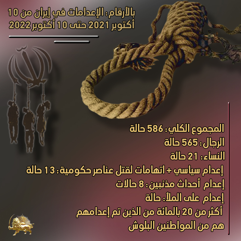 بالتزامن مع اليوم العالمي لمناهضة عقوبة الإعدام، بلغ عدد الإعدامات في إيران ما لا يقل عن 586 من 10 أكتوبر 2021 إلى 10 أكتوبر 2022.