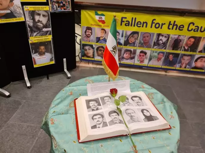 وعرضوا صور شهداء ثورة الشعب الإيراني الديمقراطية، التي نُصبت على لافتات صفراء كبيرة، أمام الرأي العام للمواطنين السويديين.