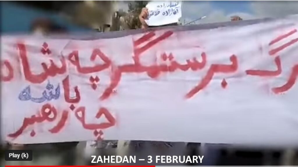 الجمعة، 3 فبراير، وفي اليوم الـ 141 للانتفاضة على مستوى البلاد، بدأ الآلاف من أبناء زاهدان الشجعان، على الرغم من الاعتقالات الواسعة والإجراءات القمعية الشديدة من قبل قوات الحرس والقوات القمعية التابعة لخامنئي، مرة أخرى مظاهرات مناهضة للحكومة في الشوارع بعد صلاة الجمعة.