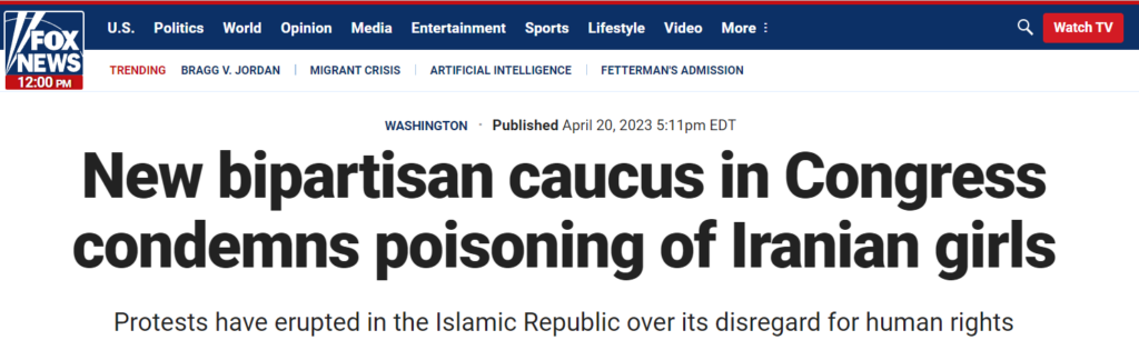 أفاد موقع فوكس نيوز عن تشكيل “المجموعة البرلمانية النسائية الإيرانية” في الكونجرس الأمريكي ، برئاسة النائبة في الكونجرس شيلا جاكسون لي من الحزب الديمقراطي ونانسي ميس من الحزب الجمهوري ، والتي أصدرت قرارًا من الحزبين يدين تسميم فتيات المدارس. على يد الديكتاتورية الحاكمة في إيران وكتب فوكس نيوز:
