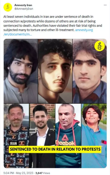 يُحكم على سبعة أفراد على الأقل في إيران بالإعدام فيما يتعلق بالاحتجاجات على مستوى البلاد، بينما يتعرض عشرات آخرون لخطر الحكم عليهم بالإعدام. وقد انتهكت السلطات حقوقها في المحاكمة العادلة وتعرضت الكثيرين للتعذيب وغيره من ضروب سوء المعاملة، بما في ذلك الجلد والصدمات الكهربائية والتهديدات بالقتل والعنف الجنسي. وسط تصاعد عمليات الإعدام منذ أواخر أبريل، في 19 مايو، أعدمت السلطات بشكل تعسفي المتظاهرين المعذبين ماجد كاظمي وسعيد يغوبي وصالح ميرهاشمي في أصفهان، الذين أدينوا ظلماً وحكم عليهم بالإعدام.