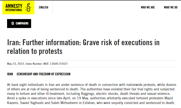 كتبت منظمة العفو الدولية في بيان حول زيادة عدد السجناء السياسيين في إيران فيما يتعلق بالاحتجاجات الوطنية في 23 مايو حكم على ما لا يقل عن سبعة أشخاص في إيران بالإعدام لمشاركتهم في مظاهرة وطنية، في حين يواجه العشرات الآخرين خطر الحكم عليهم بالإعدام.