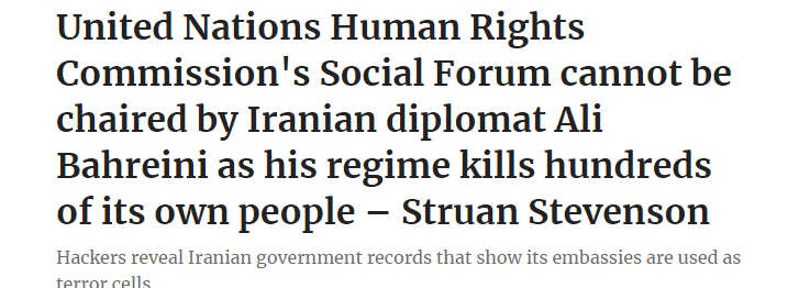 لا يمكن أن يرأس المنتدى الاجتماعي للجنة حقوق الإنسان التابعة للأمم المتحدة الدبلوماسي الإيراني علي بحريني لأن نظامه يقتل المئات من شعبه – ستروان ستيفنسون