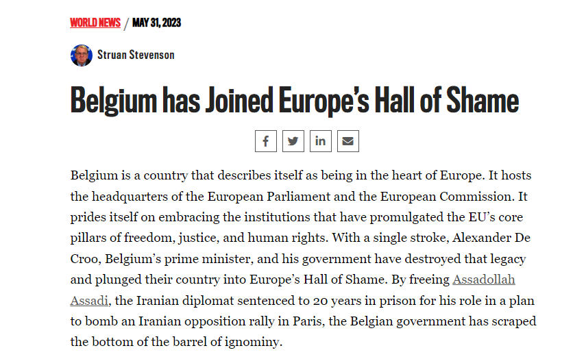 بلجيكا بلد يصف نفسه بأنه يقع في قلب أوروبا. تستضيف مقر البرلمان الأوروبي والمفوضية الأوروبية. وهي تفتخر باحتضان المؤسسات التي أصدرت الركائز الأساسية للاتحاد الأوروبي المتمثلة في الحرية والعدالة وحقوق الإنسان. بضربة واحدة، دمر ألكسندر دي كرو، رئيس وزراء بلجيكا، وحكومته هذا الإرث وأغرقوا بلادهم في قاعة العار الأوروبية. بإطلاق سراح أسد الله أسدي، الدبلوماسي الإيراني المحكوم عليه بالسجن 20 عامًا لدوره في خطة لتفجير تجمع للمعارضة الإيرانية في باريس، وقعت الحكومة البلجيكية في أسفل برميل العار.