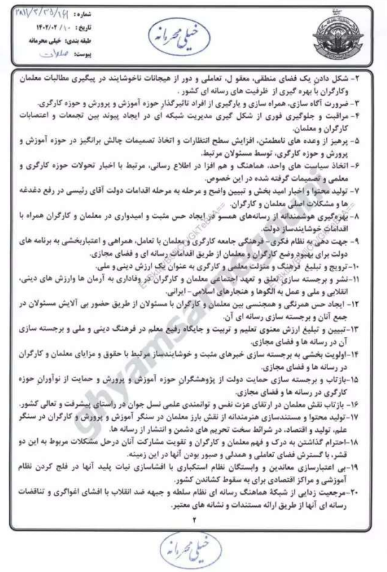 في حين أن الرسالة تعترف ضمنيًا بأن النظام الثيوقراطي الحاكم ليس له حل ذي مغزى للأزمات الاجتماعية والاقتصادية في البلاد، فإنها تدعو إلى سياسات أكثر خداعًا، وتأمر وسائل الإعلام الحكومية بتحريف الحقيقة وتعكس «الإجراءات الإيجابية» غير الموجودة لحكومة إبراهيم رئيسي لتحسين المعلمين و «معيشة العمال».