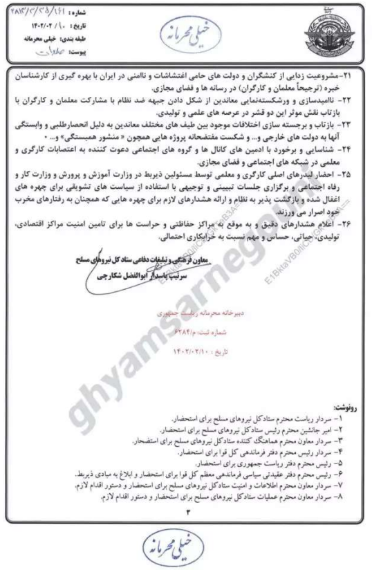 الوثائق التي وقعها عميد الحرس أبو الفضل شكارشي و يسلط الضوء على دور المعارضة المنظمة، أو كما يقول «العدو»، من خلال ما يسمى «الكشف عن نواياهم لتعطيل النظام التعليمي والمراكز الاقتصادية لزعزعة استقرار البلاد».