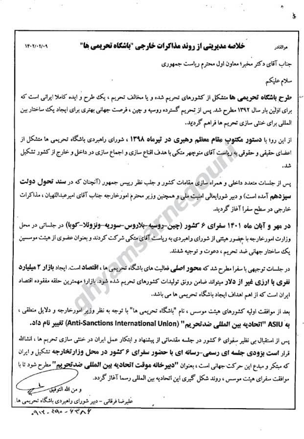 تشير الوثائق، التي نشرتها مجموعة “قیام تا سرنکوني” على تلغرام، بوضوح إلى أن محاولات الحكومات الغربية “للدخول في مفاوضات مع هذا النظام لا تؤدي إلا إلى مصلحتها. ولم تبد طهران الاستعداد أو القدرة على تغيير سياساتها الداخلية والخارجية. وبدلاً من ذلك، تسعى إلى تشكيل تحالفات تعطل النظام العالمي إلى الأسوأ.