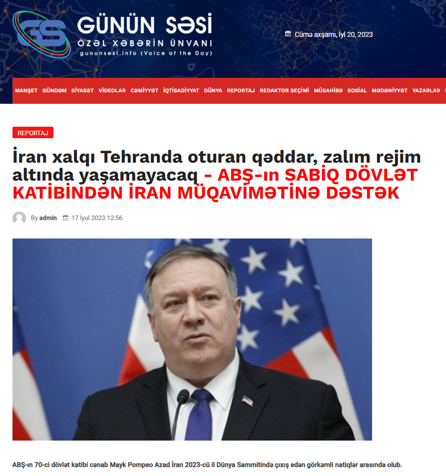 موقع صوت جمهورية أذربيجان 16 يوليو: مايك بومبيو هو أحد المتحدثين البارزين في القمة العالمية لإيران الحرة 2023: ستضع قيادة السيدة مريم رجوي أسس جمهورية حرة ومستقلة وديمقراطية في إيران. كما أود أن أقدر شجاعة وتضحيات كل الإيرانيين منذ شهر سبتمبر من العام الماضي وشهدت احتجاجات هؤلاء المتظاهرين ضد وحشية النظام الإيراني ، ولمدة 10 أشهر ، تسمع صرخاتهم في جميع أنحاء العالم.