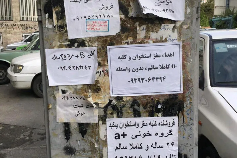 الجدران المحيطة بالمرافق مثل مستشفى هاشمي نجاد في طهران مليئة بإعلانات بيع أعضاء الجسم. السلطات ترسم الجدران لتغطية الإعلانات. لكن البائعين يواصلون عرض أرقام هواتفهم بخطوط دقيقة وجريئة باستخدام علامات أو بخاخات.