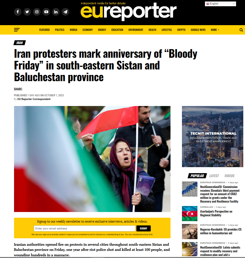 كتب اي يو ريبورتر في الأول من اكتوبر عن انتفاضة المواطنين البلوش في زاهدان، خاش، تفتان، سوران، وراسك في ذكرى الجمعة الدامية في زاهدان: بعد مرور عام على قيام شرطة مكافحة الشغب بقتل ما لا يقل عن 100 شخص وإصابة مئات الأشخاص في مجزرة، أطلقت سلطات النظام الإيراني، اليوم الجمعة، النار في عدة مدن جنوب شرقي محافظة سيستان وبلوشستان.
