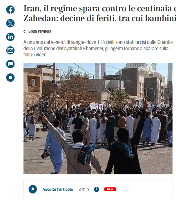في مقاطع الفيديو التي أرسلت من زاهدان، نسمع طلقات نارية. عاد حرس لاستخدام بنادقهم ضد المظاهرة السلمية للبلوش الذين التقوا في شوارع المدينة تخليدا لذكرى الجمعة الدامية. قبل عام، قتل النظام أكثر من مائة مدني، مسجلاً الرقم القياسي للقتلى في يوم واحد في الاحتجاجات التي انفجرت بعد وفاة مهسا أميني، الشابة الكردية التي قتلت بركلات وقبضات الشرطة الأخلاقية من أجل الحجاب القسري.