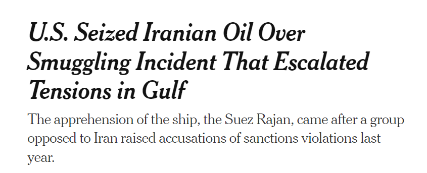نيويورك تايمز 6 سبتمبر: صادرت حكومة الولايات المتحدة ما يقرب من مليون برميل من النفط الخام الإيراني تقول إنه تم تهريبها إلى الصين في انتهاك للعقوبات الأمريكية ضد إيران، بعد أن أثارت تهديدًا بالملاحقة القضائية لإحضار الناقلة إلى المياه الأمريكية، وفقًا لأوراق المحكمة التي تم الكشف عنها حديثًا يعرض.