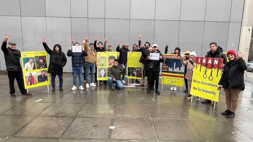 في الصف الأمامي للوقفة، كانت هناك صور لشهداء الانتفاضة الوطنية في إيران ولافتة تدين موجة الإعدامات في إيران.