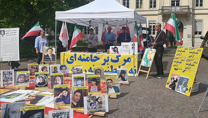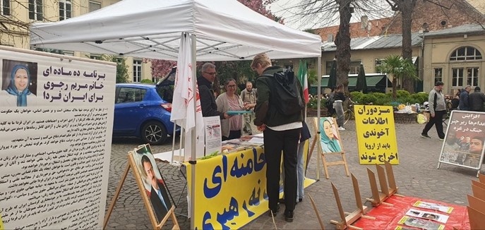 في هذا المعرض، شوهدت لافتة تحمل صورة للسيدة مريم رجوي الرئيسة المنتخبة من قبل المقاومة الإيرانية ونص خطتها من عشر مواد من أجل إيران الحرة. كما تم عرض صور للإعدامات العشوائية أمام الملأ وسجون النظام.
