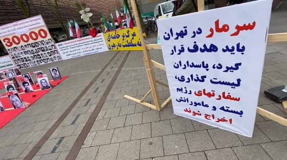 وكتبت على إحدى اللافتات في الصف الأول: ضعوا وزارة المخابرات والحرس في قائمة الإرهاب واطردوا مرتزقة نظام الملالي من أوروبا.