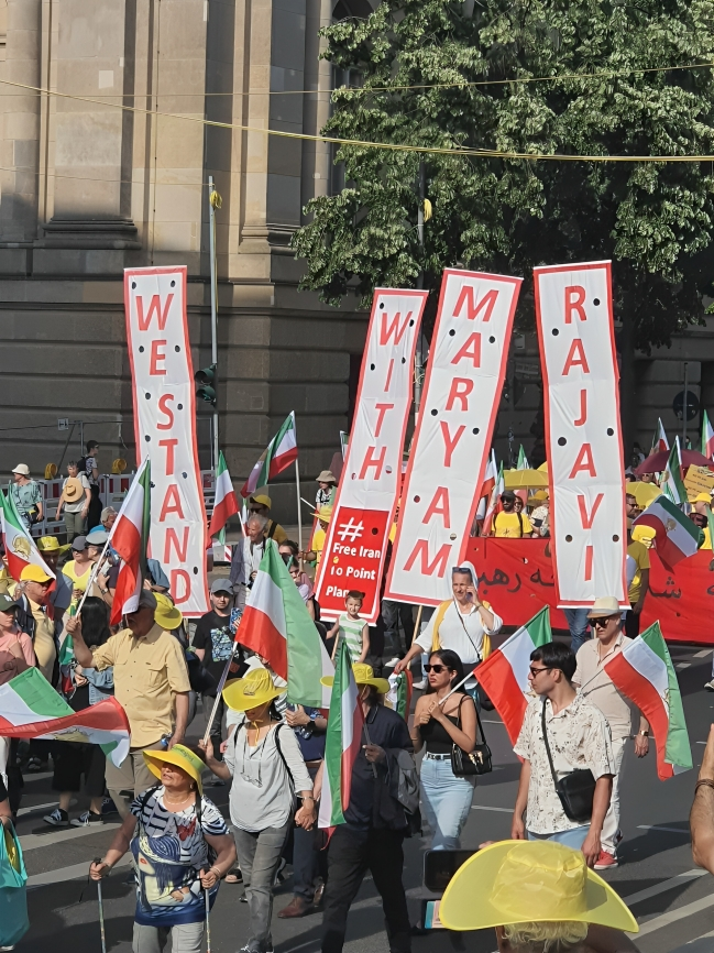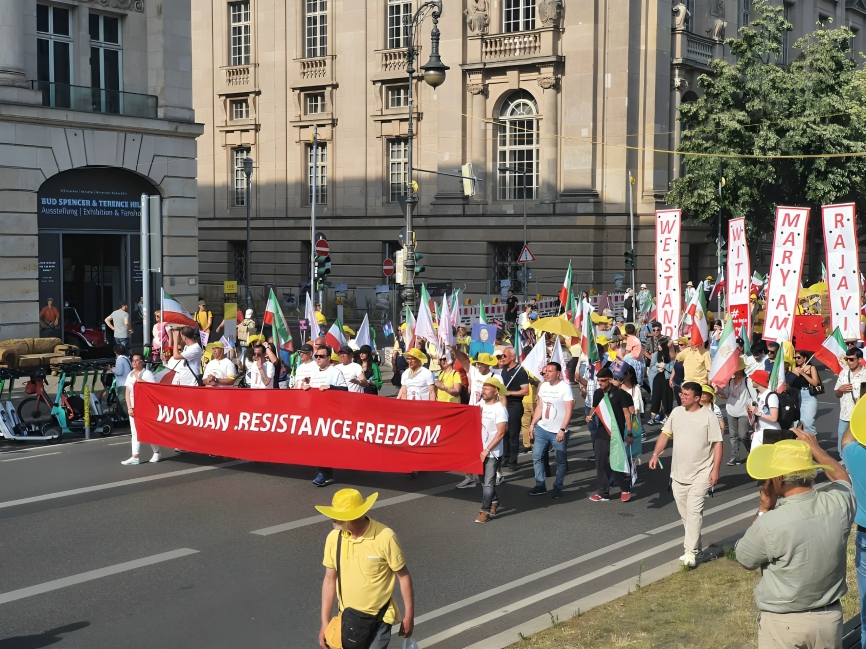تظاهر عشرات الآلاف من الإيرانيين في برلين يوم السبت 29 يونيو، ضد النظام الحاكم في إيران. . وأقيمت هذه التظاهرة بمناسبة التجمع السنوي للمقاومة الإيرانية. وخرج المتظاهرون في شوارع برلين وأعلنوا دعمهم للسيدة مريم رجوي الرئيسة المنتخبة من قبل المقاومة الإيرانية، بشعارات مرفوعة. وحضر مظاهرة برلين بعض الشخصيات الدولية البارزة وأعضاء من البرلمان الألماني وألقوا كلمات.