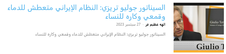 نشر موقع “أجنبارل” بتاريخ 30 يونيو 2024 مقالًا بعنوان “إيران تستحق مؤسسات ديمقراطية وليست هذا النظام الثيوقراطي”، حيث تحدث السيناتور جوليو تيرزي من حزب “إخوة إيطاليا” عن حاجة الشعب الإيراني إلى مؤسسات ديمقراطية يقودها شخصيات سياسية وأخلاقية رفيعة المستوى، بدلاً من النظام الثيوقراطي الحالي.