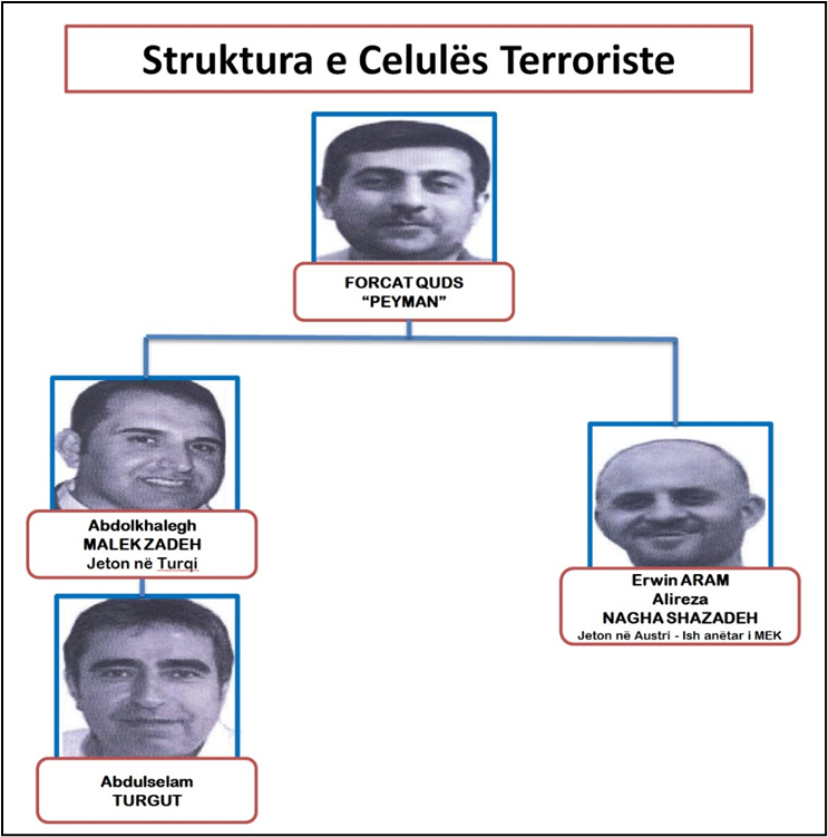 ويقود الخلية الإرهابية عنصر في فيلق القدس يعرف باسم بيمان. مقر إقامة بيمان الدائم في إيران ويدير عن بعد عددا من العمليات في ألبانيا ووسط وغرب أوروبا. منها ، بدأ ونفذ الهجوم الفاشل الأخير في مارس 2018. بيمان مسؤول عن العديد من العملاء ، بعضهم يستخدم لجمع المعلومات الاستخباراتية وغيرهم لتنفيذ هجمات إرهابية.
