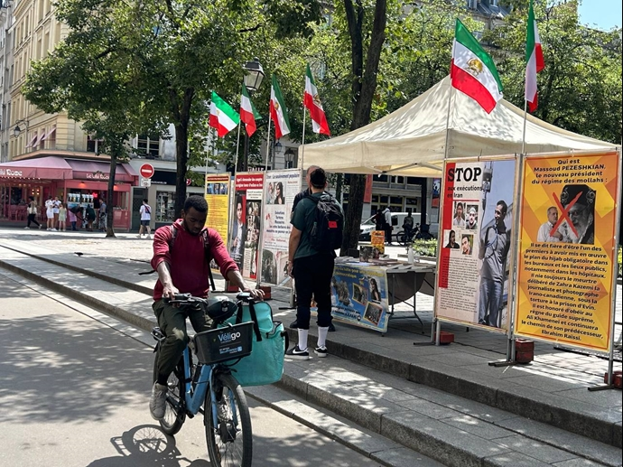 أقام أنصار منظمة مجاهدي خلق الإيرانية وأنصار مقاومة الشعب الإيراني يوم الخميس 1 أغسطس معرضا لصور الشهداء وطاولة كتب في وسط باريس تضامنا مع انتفاضة الشعب الإيراني في جميع أنحاء البلاد.