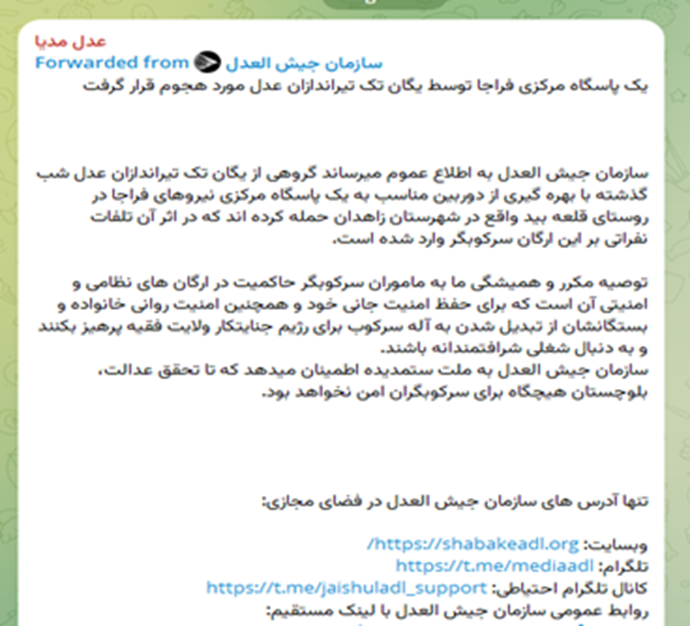 أعلنت منظمة “جيش العدل” يوم الجمعة أن وحدة القناصة التابعة لها شنت هجومًا على مركز قيادة مركزي لقوات الشرطة في قرية قلعة بيد الواقعة في محافظة زاهدان، مساء الليلة الماضية. وأفادت المنظمة بأن الهجوم أسفر عن سقوط عدد من القتلى في صفوف هذه القوات القمعية.