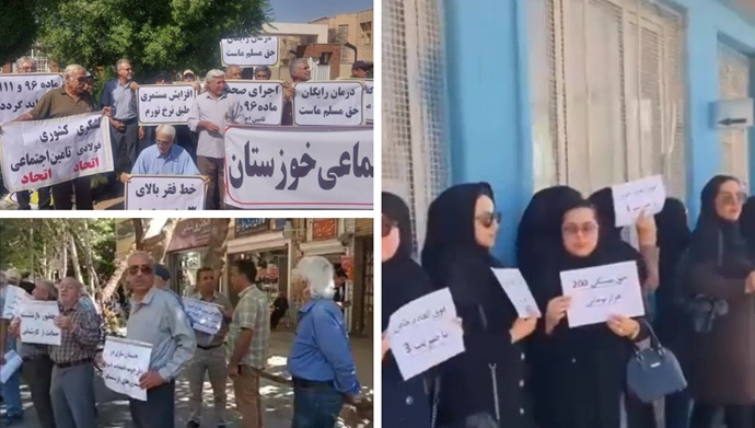 في طهران ومشهد، تجمع عدد من المتقاعدين من التأمين الاجتماعي أمام مباني التأمين الاجتماعي. وبشعارات مثل “كفى إشعال الحروب، مائدتنا فارغة”، عبروا عن استيائهم من سياسات الحكومة. هذا الشعار يظهر بوضوح استياء الشعب من الإنفاق الضخم للنظام على المغامرات الإقليمية والقمع الداخلي. حيث عبر المتقاعدون عن غضبهم من أن الموارد المالية للبلاد تُستنزف لدعم الجماعات الإرهابية وإشعال الحروب في المنطقة بدلاً من تحسين رفاهية ومعيشة الشعب.