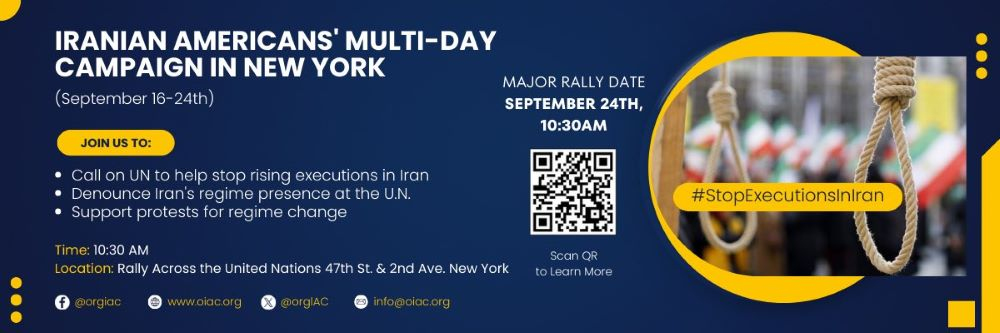 كما دعا أنصار المقاومة الإيرانية جميع الإيرانيين الأحرار للمشاركة في المظاهرة الكبرى التي ستقام يوم الثلاثاء، 24 سبتمبر 2024، الساعة 10:30 صباحًا أمام الأمم المتحدة في نيويورك. تهدف هذه المظاهرة إلى إدانة الدكتاتورية الدينية والإرهابية للنظام الإيراني ورئيسه غير الشرعي، والمطالبة بإنهاء سياسة الاسترضاء مع هذا النظام. كما يطالبون المجتمع الدولي بدعم الشعب الإيراني ومقاومته ونضاله من أجل حرية إيران.