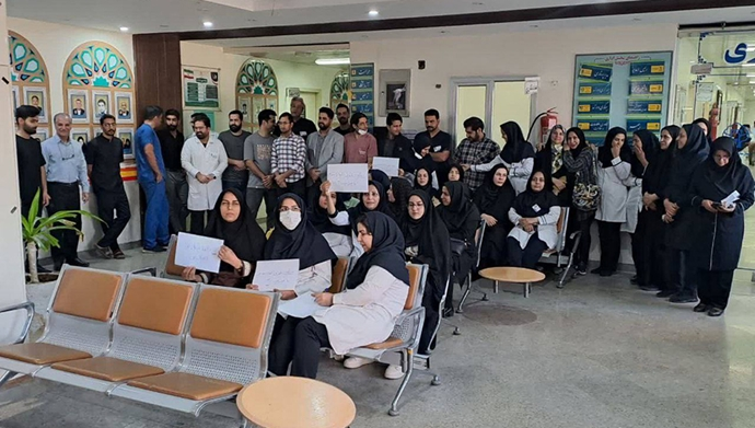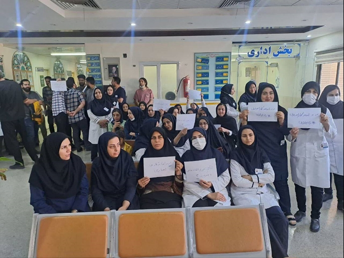 ونظم الممرضون والعاملون في مستشفى “ولي عصر” في بافق في محافظة يزد تجمعًا احتجاجيًا اعتراضًا على عدم دفع المستحقات الخاصة، التعرفة والحوافز، مطالبين بحقوقهم التي تم تجاهلها.