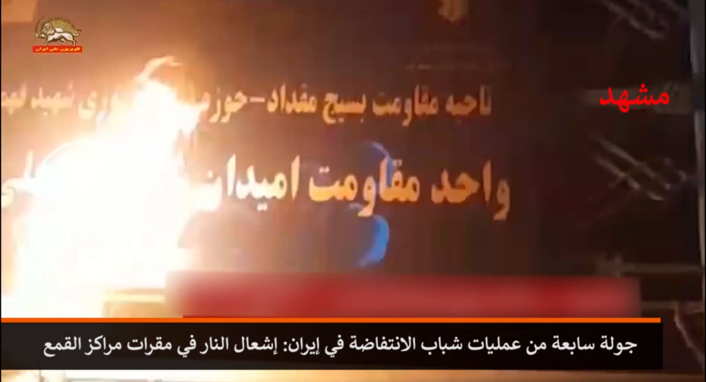 وفي مشهد، شهدت عدة مواقع حيوية للنظام عمليات حرق متزامنة. هذه العمليات تعبر عن مستوى التنسيق العالي بين وحدات الانتفاضة وتعكس الاستياء العميق من دور الباسيج في قمع والسيطرة.