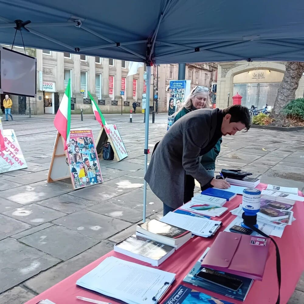 مانشستر، إنجلترا – طاولة كتاب ومعرض لصور شهداء الانتفاضة الإيرانية