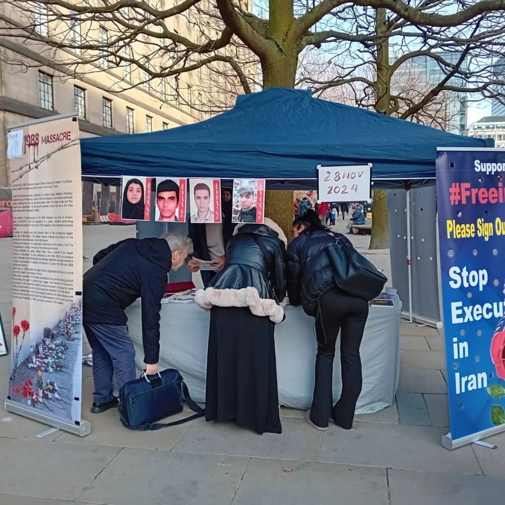 في 27 و 28 تشرين الثاني/نوفمبر، أقام أنصار منظمة مجاهدي خلق الإيرانية وأنصار المقاومة الإيرانية معرضا لصور الشهداء وطاولة كتب في وسط مانشستر بإنجلترا، تخليدا لذكرى شهداء الانتفاضة الوطنية في إيران.
