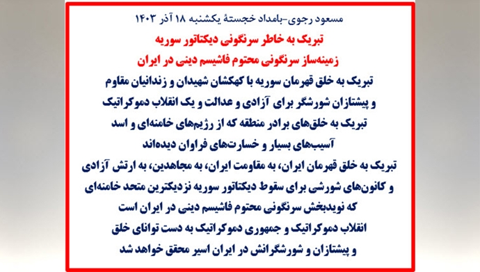 - مسعود رجوي: تهنئة للشعب السوري البطل بمناسبة سقوط دكتاتور سوريا ـ إسقاط دكتاتورية سوريا مقدّمة لإسقاط الفاشية الدينية في إيران دون شك