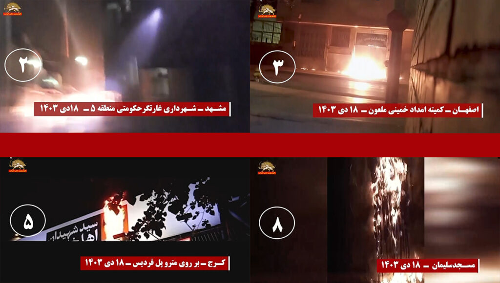 شهدت الأيام الأخيرة سلسلة من العمليات الجريئة التي نفذها شباب الانتفاضة في مختلف أنحاء إيران، استهدفت رموز النظام ومؤسساته القمعية. تضمنت هذه الأنشطة تفجيرات طالت مباني حكومية، وإحراق لافتات شخصيات النظام، وحرق منشآت مرتبطة بحرس النظام الإيراني وميليشياته. تعكس هذه العمليات إصرار شباب الانتفاضة على فضح الفساد والمطالبة بالمحاسبة والسعي لتحقيق الحرية للشعب الإيراني.