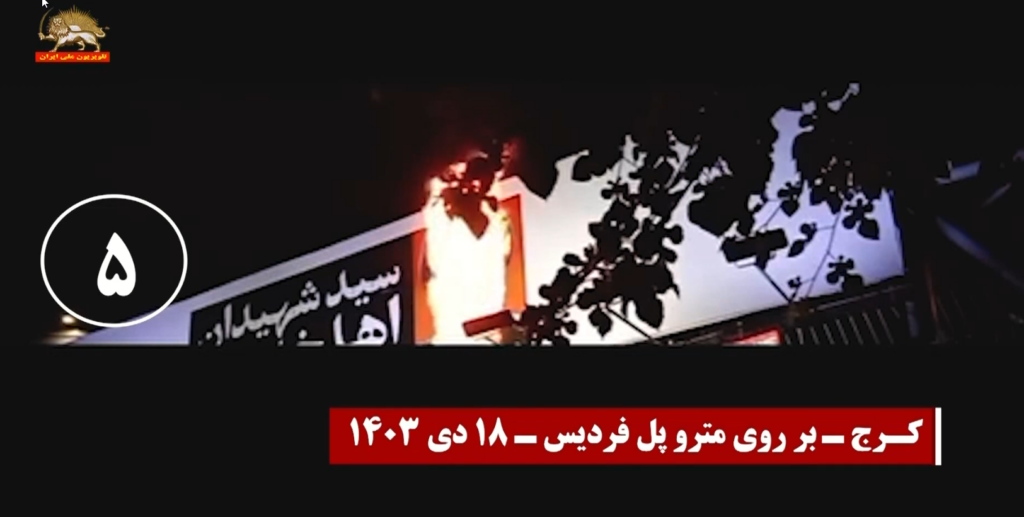 في طهران وكَرَج وكرمان، أقدم شباب الانتفاضة على إحراق لافتات تحمل صور قاسم سليماني ورئيسي وخميني. تعكس هذه الأعمال الرفض الشعبي العميق لرموز مسؤولة عن القمع والانتهاكات الواسعة لحقوق الإنسان وتصدير العنف في المنطقة. جاء إحراق هذه اللافتات على جسور وطرقات رئيسية ليؤكد الغضب الشعبي تجاه رموز النظام.