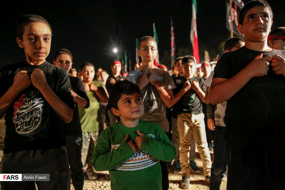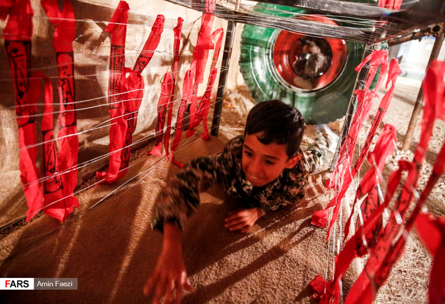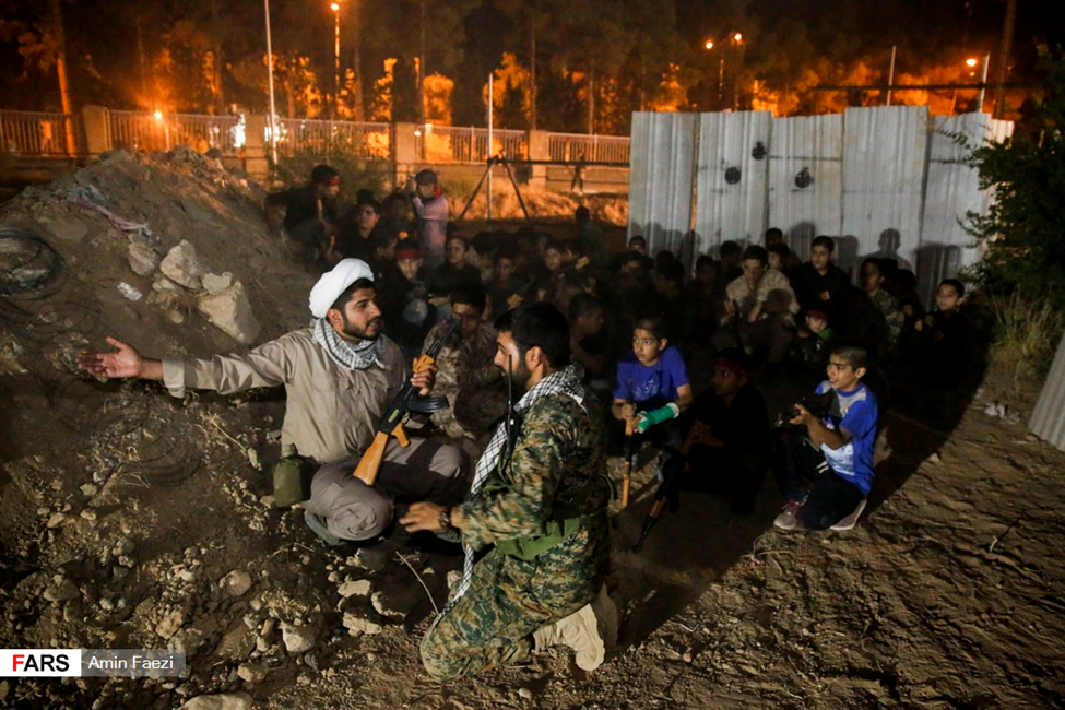 “قام أطفال مدينة شيراز، في حديقة جنة بمناسبة أسبوع الدفاع المقدس، بمحاكاة عملية تحرير مرتفعات الشيحة بمحافظة حماة في سوريا من قبل كتيبة الفاتحين التابعة للواء 19 فجر في محافظة فارس. وشارك في هذا العرض أطفال تتراوح أعمارهم بين 6 إلى 12 عامًا.”