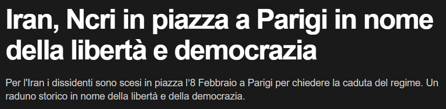 في 8 فبراير 2025، احتشد آلاف الإيرانيين المعارضين في باريس في تظاهرة حاشدة نظّمها المجلس الوطني للمقاومة الإيرانية (NCRI)، وفقًا لتقرير نشره موقع Stylo24.it. وجاءت هذه المظاهرة في الذكرى الـ 46 للثورة المناهضة للنظام الملكي عام 1979، حيث أكدت المعارضة على مطالبها بإسقاط النظام وإقامة جمهورية ديمقراطية.
