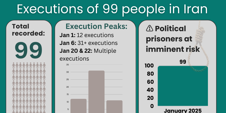 إنفوجرافيك – تقریر شهري لانتهاكات حقوق الإنسان في إيران: 99 إعدام في يناير 2025
